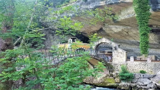 La Virgen de la Cueva es un pequeñísimo santuario en Infiesto en un escenario especialmente curioso. Es una cueva natural bajo una enorme roca y bordeada por el río La Marea.