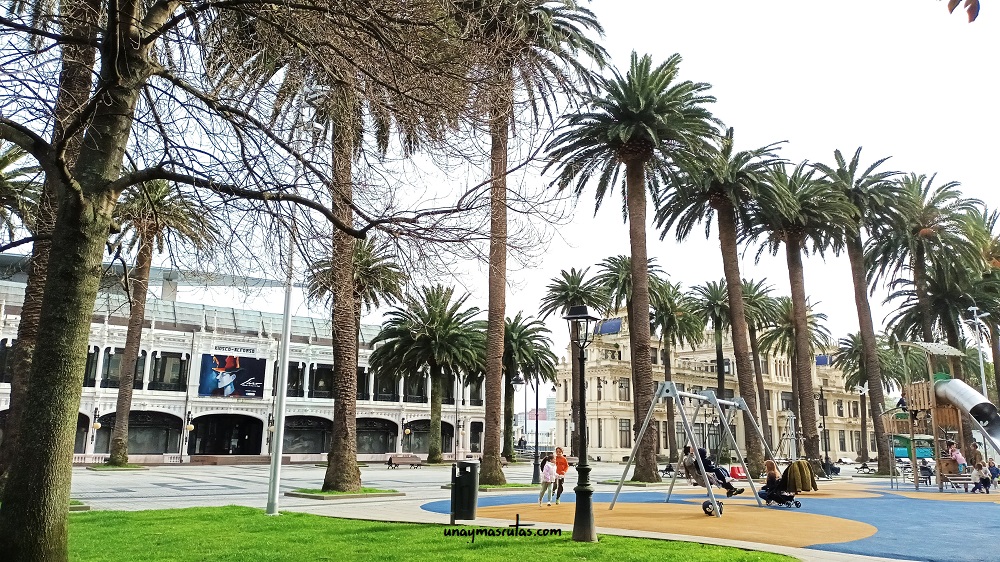 Se accede a ella por estos escalones y dentro de ella encontrarás bancos, árboles y jardines, unas fuentes que consisten en agua que brota del suelo para disfrute de las palomas y dos esculturas. Es un lugar acogedor y en general, lleno de gente. Puede ser debido a que está rodeado de calles con bares y restaurantes o porque las vistas son tan relajantes que apetece quedarse un rato bajo la sombra de sus árboles.