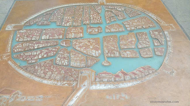 El casco antiguo nos recibe con un original mapa en el suelo
