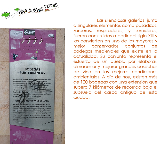 Traemos aquí una reseña histórica que el ayuntamiento ofrece en las calles del casco antiguo y que se constituye en una invitación, por si acaso teníamos de dudas de quedarnos o no, a visitar al  menos una de las bodegas subterráneas