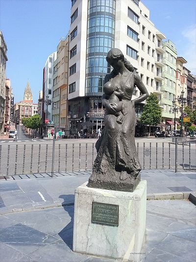 O también esta escultura, Maternidad, ubicada es una de las esquinas más populares, justo en frente de la Plaza La Escandalera, el cruce con la calle Fruela desde donde también podemos ver parte de la Catedral de Oviedo.