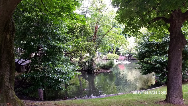 Un estanque con patos, un poco más allá, mesas y sillas para el disfrute de todos.