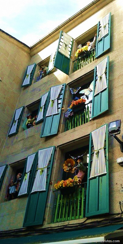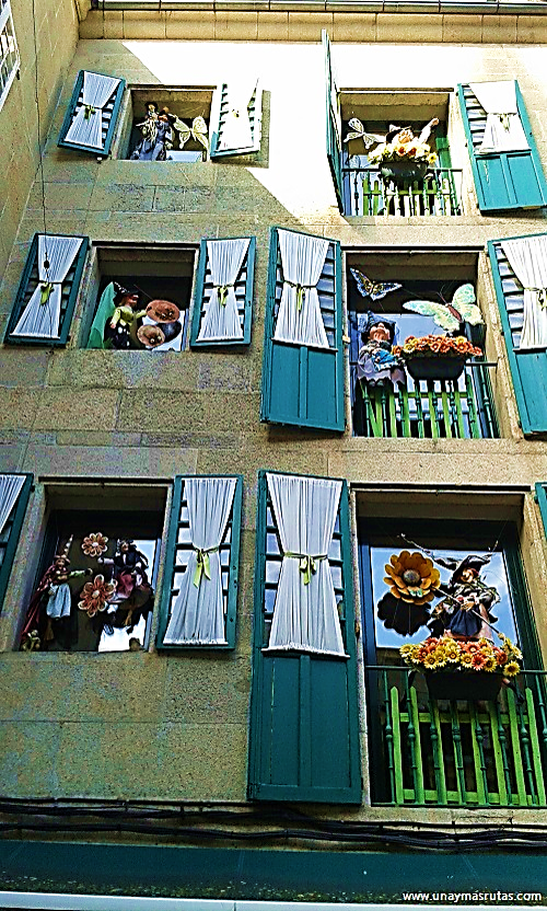 De un lado a otro y sin querer perder ningún detalle, nos llamó la atención estas simpáticas ventanas decoradas con muñecas que alegran la fachada del edificio.