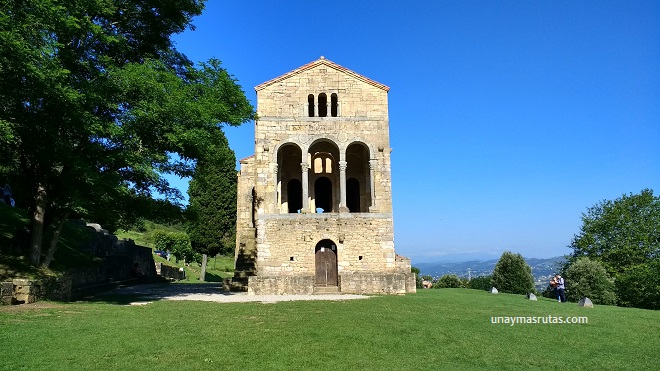 En esta misma ruta hacia el Cristo del Naranco, sin desviarte de la carretera y a solo unos metros después, si quieres acercarte hasta aquí luego de subir hasta el Cristo, o en primer lugar, si decides visitarla antes, te toparás con la Iglesia de San Miguel del Naranco.