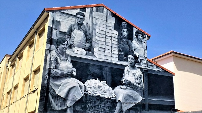 La escena de este mural corresponde a una fotografía de 1927 que muestra la fabricación de las cajas de madera de las mantecadas.