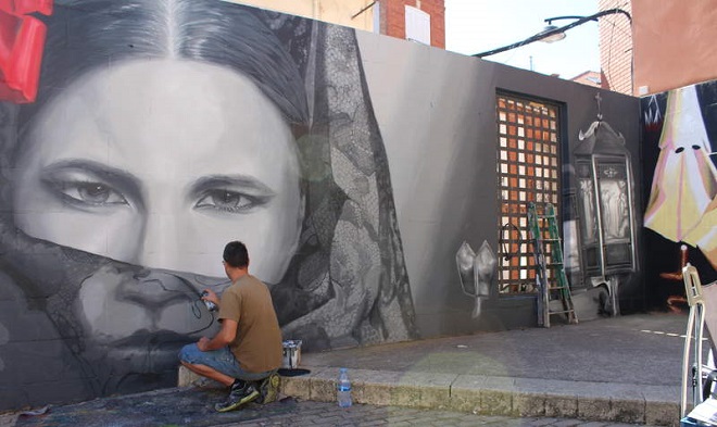 Justo en frente de este mural, en la misma calle Los Sitios apenas unos años más tarde, concretamente en marzo del 2019, el mismo autor David Esteban, conocido como Dadospuntocero, recrea una escena de la guerra napoleónica.