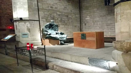 Esta escultura muestra una faceta desconocida para muchos. Si observas bien, verás sus manos extendidas y los pies descalzos. Dicen que pidió limosna para pagar sus estudios y ayudar a los pobres.