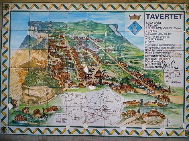 Esta es la bienvenida al pueblo, este simpático mapa nos orienta sobre las actividades, rutas de senderismo y lo que más nos atrae de Tavertet, sus riscos. Ese fabuloso mirador con unas vistas verdaderamente asombrosas ¡vamos para allá!