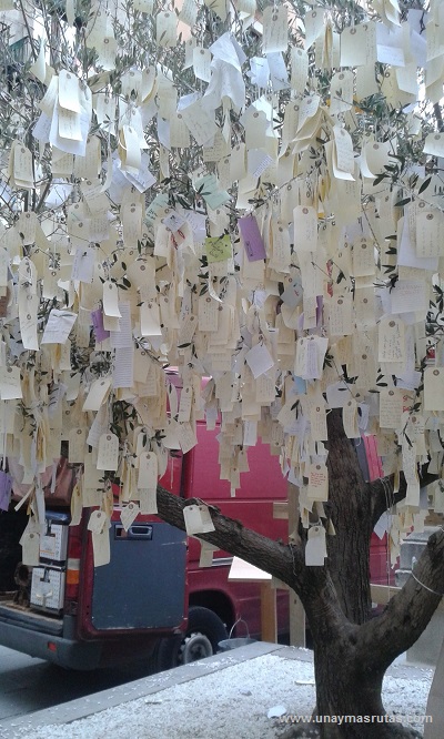 Llegando a la Plaza Mayor y luego de la Plaza del Pes, nos detenemos a disfrutar de variedad gastronómica de Vic, aquí nos encontramos con dos interesantes imágenes, por una parte el árbol que tal como nos explicaron se acostumbra poner sobre sus ramas los deseos para el siguiente año y la estatua del Merma